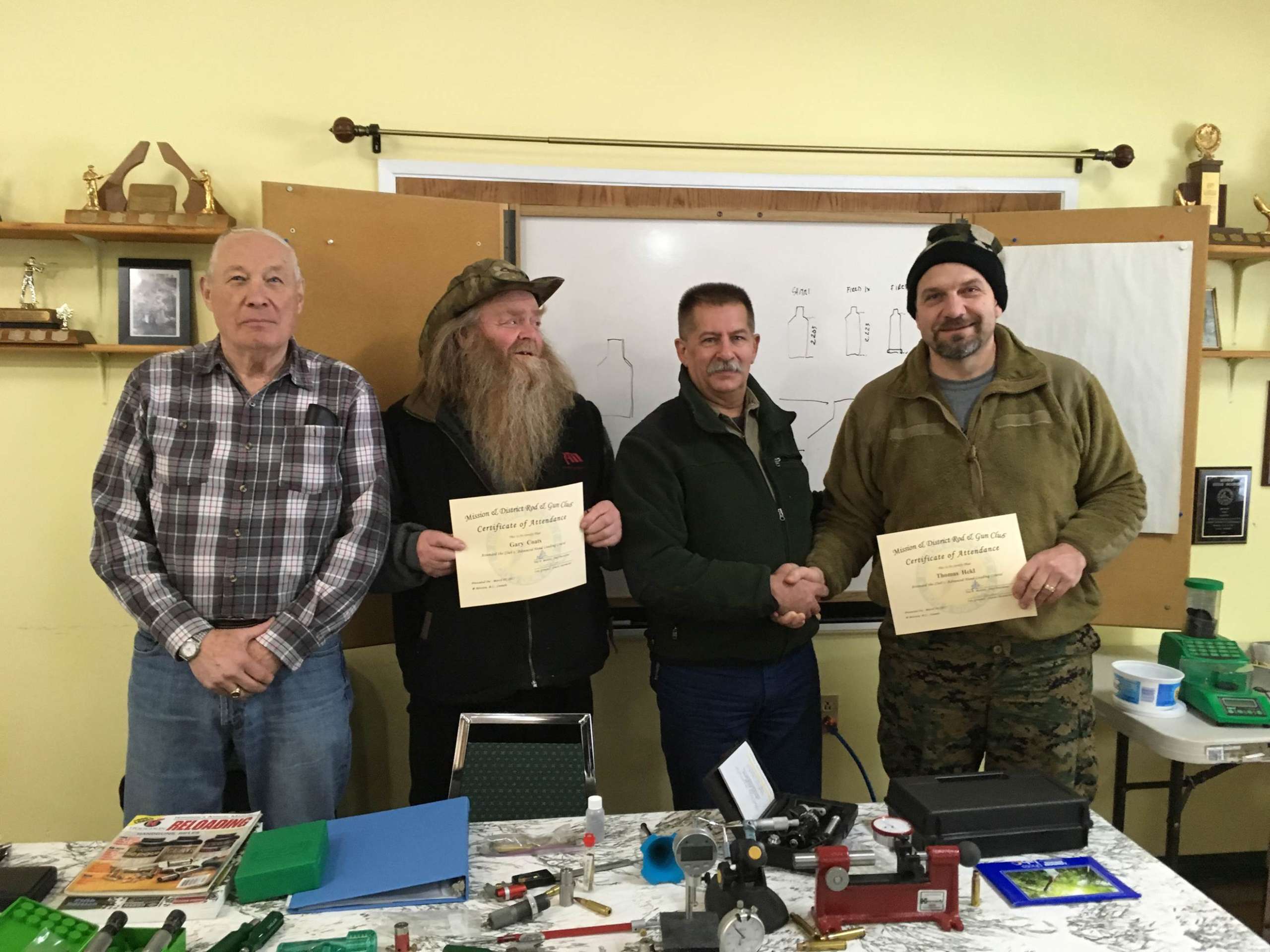 Congratulations to all the participants of the Basic and Advanced Hand Loading courses this past weekend. Len Grinnell Instructor, Garry Coates, Tex Mahler President, Thomas Heckl